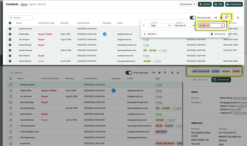 🚀 You're working with a builder and investor, you may wish to create a tag "Builder" and "Investor" and tag the contact both. If you ever need to send important information to your "Builder" tagged clients... you can tag filter (in Contacts) and send an email to that list.