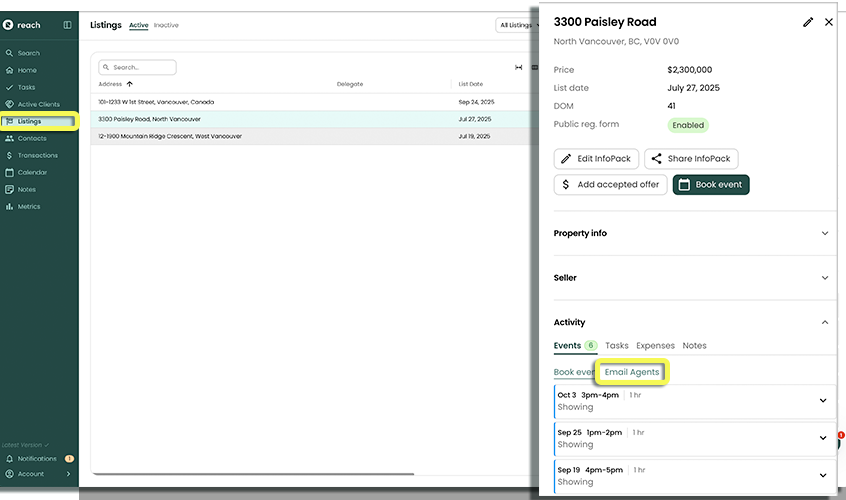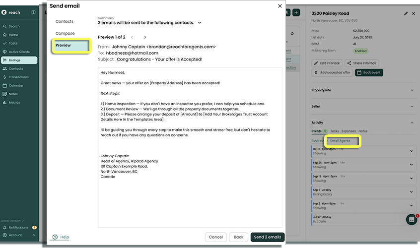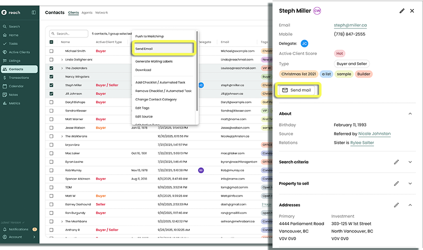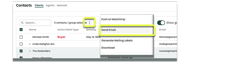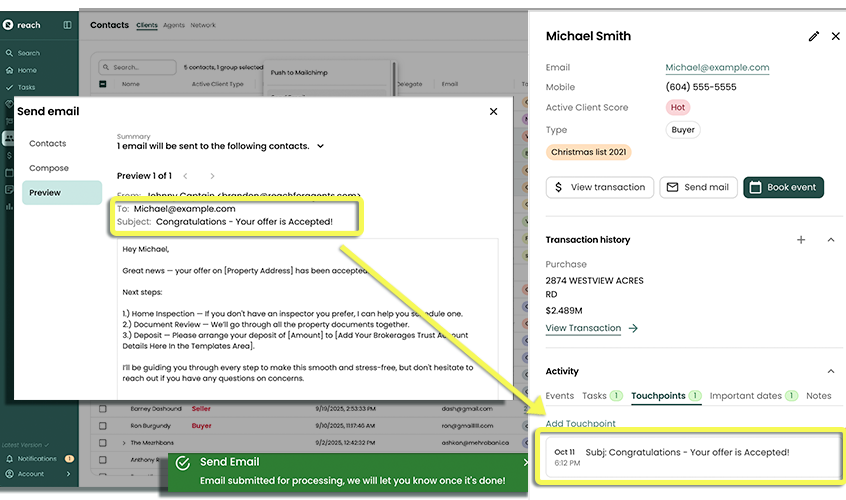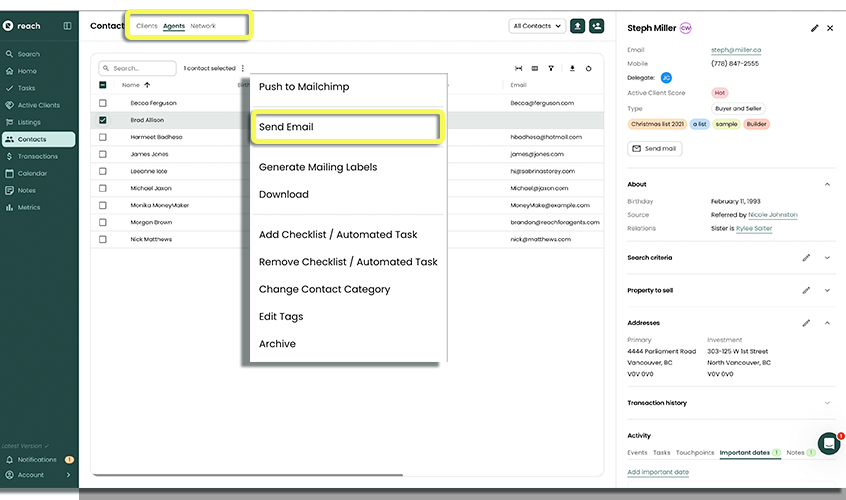 With Reach, you can send emails one-to-one or to a group of contacts— whether it’s clients or agents. Compose a message on the spot, or save time by using a template you’ve already set up.