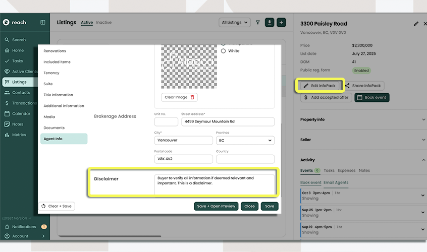 To edit the default agent and brokerage information that is used for all InfoPacks™, do so in Settings -> Agent Info. The default Additional Agents and Disclaimer can be configured in Settings -> InfoPack.