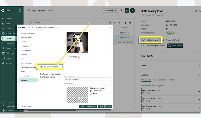 Most InfoPacks™ are set up to display the agent and their brokerage, and this information is typically consistent across all of a user’s InfoPacks™. However, there are times when you may want to customize the agent or brokerage information for a single InfoPack™ without affecting the defaults used in your other InfoPacks™.