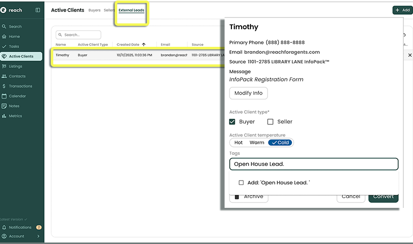 In addition to creating a new Active Client, the original External Lead will be archived.