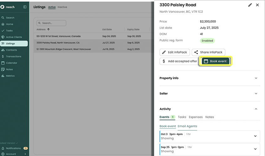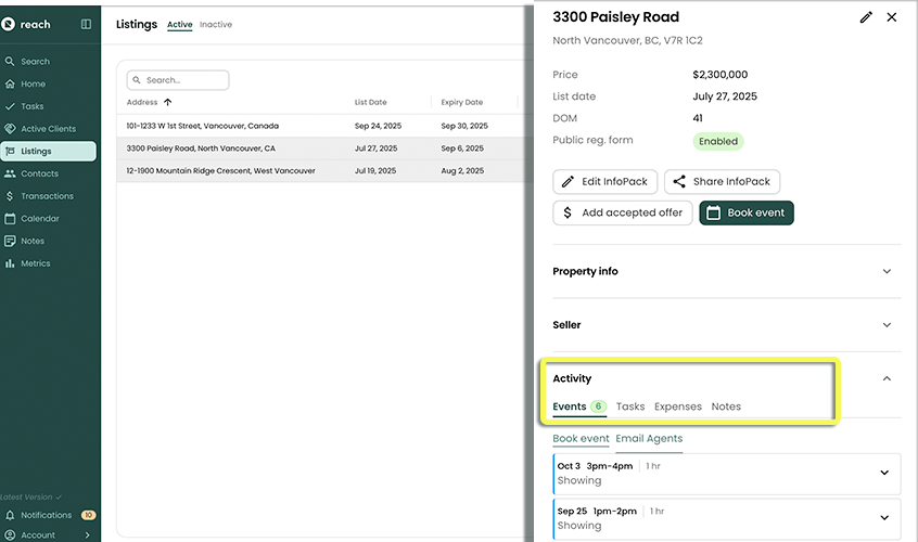 Each Listing in Reach includes an Activity tab at the bottom of the screen, giving you a clean, chronological timeline of everything that’s happened — and what’s still outstanding.