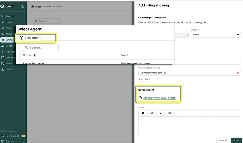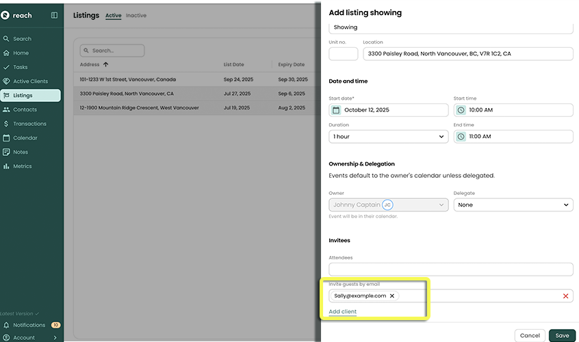 cautionInviting a "Guest by Email" will invite your client (seller, in this case). This will invite them via a Google or Outlook event invitation. The sellers will see any event notes that you put in Google or Outlook and as well linked buyer agent details. They become a party to the invite like others.