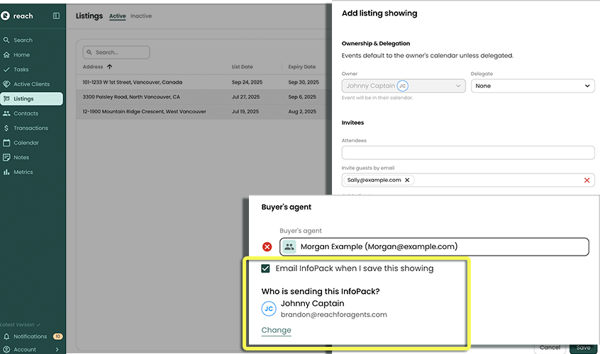 Once you've added an Agent, if that Agent has an associated email address, Reach will prompt you if you would like to "Email InfoPack when I save this showing" this feature lets you automatically email the InfoPack, when you save the Event to your Calendar.