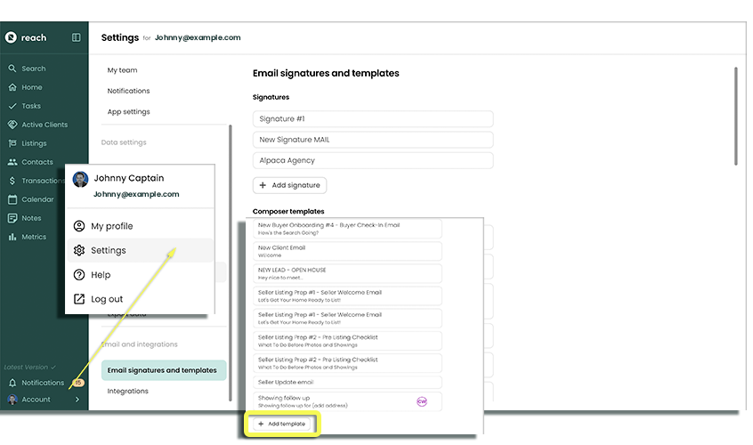 - Click on + Add Template, from the Composer templates. info- Note: Your trusted team at Reach CRM has pre-populated your email templates with valuable pre-written templates already. You may need to scroll to the bottom to find the "+ Add Templates"