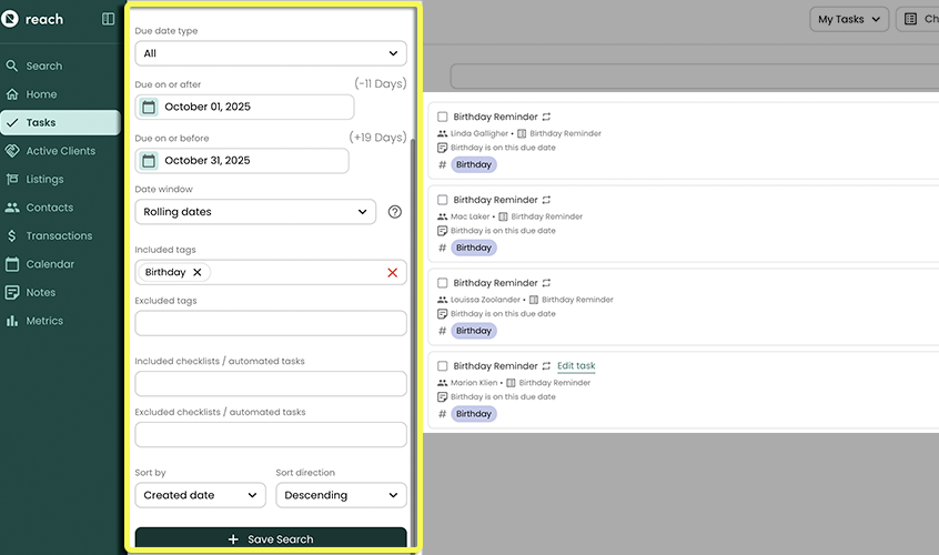 These Saved Searches act as dynamic groupings, allowing you to cluster and view specific types of Tasks with ease. Whether it’s upcoming deadlines, follow-ups, or team assignments, Saved Searches give you quick, organized access to exactly what matters most.