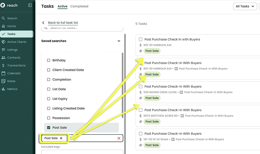 Agent Tom has created a few Automated Tasks, each Automated Task included various tags. One that he applied to 3 Automated Tasks was “Post Sale”. These Automated Tasks Tom created, were designed to reflect all Tasks that happen after (ie 'post') a Transaction Sale.