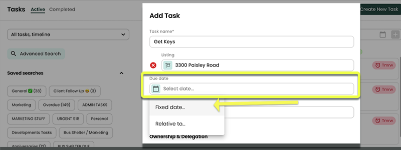 This feature is an advanced feature, for advanced users. Relative due dates require users to setup due dates that are related to other conditional dates within the system. Users can select Relative Due Dates for Tasks associated with Clients, Listings and Transactions.