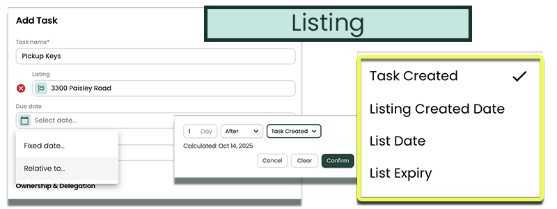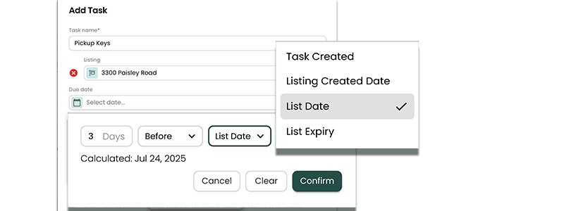 Example: Perhaps a user wants to create a Task as a reminder to pickup keys from a seller 3 days before a Listing Date. This type of Due Date is related to the selected List Date in the Listing section of Reach.