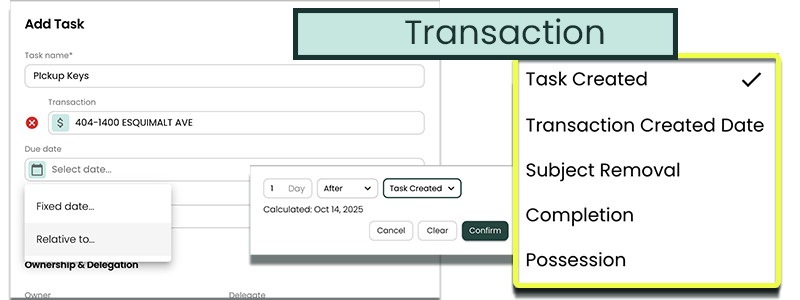 Transaction | Possession | This option creates a Task that is due relative the Transaction's Possession Date. |