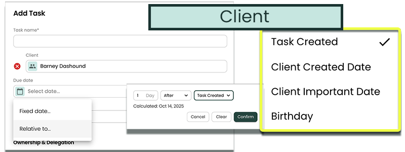 Client | Client Important Date | This option creates a Task that is relative to a specific Important Date on a Client. The name of the Important Date on the Client must match exactly. |