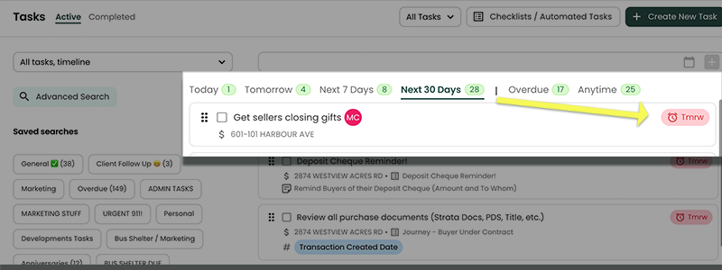 Tasks are really powerful when users connect them to Due Dates, as Reach organizes your Tasks list based on when they are due (today, tomorrow, anytime, etc). This requires users to get in the habit of entering Due Dates to Tasks, Checklists and Automated Tasks.