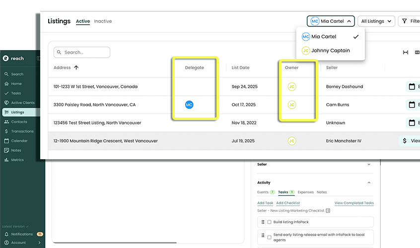 In the images above, it can be seen that the Listing: 3300 Paisley Road, North Vancouver is owned by "JC" and has been delegated to "MC"